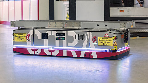 Und schaut man dem System bei seiner Arbeit zu, stellt sich wirklich schnell Bewunderung ein: Denn das FTS aus dem Hause Kuka bewegt sich völlig autonom und traumwandlerisch sicher durch sein Einsatzgebiet. Die raffinierte Antriebstechnologie erlaubt Fahrten in jede Richtung und sorgt dafür, dass der Roboter auch auf engstem Raum an die gewünschte Position navigiert. Durch seine Laser-Sensortechnologie kann das FTS auch in einem dynamischen Arbeitsumfeld bestehen. Das System erkennt andere Fahrzeuge oder Personen, weicht zuverlässig aus oder stoppt im Bruchteil einer Sekunde. Dabei stemmt es Lasten bis 1.500 kg und zeigt sich sogar lernfähig: Ein Navigationssystem mit KI-gestütztem Mapping macht‘s möglich.