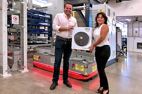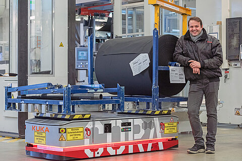 Previously, employees had to leave their workplace at the large coating machine in order to transport the master rolls they had produced. They also had to use a pallet truck to position new, empty racks in order to wind the next master roll. The racks were, in turn, brought over by their colleagues from the transport logistics department, but with our DTS, these manual processes have become a thing of the past. The robot now performs these tasks automatically, taking away finished rolls and bringing new empty racks for the next master roll. Serkan Cira is visibly happy about that: “The successful use of the DTS means less tape production downtime, which frees up additional capacity. My colleagues can now concentrate on performing tasks that cannot be done without human resources.”