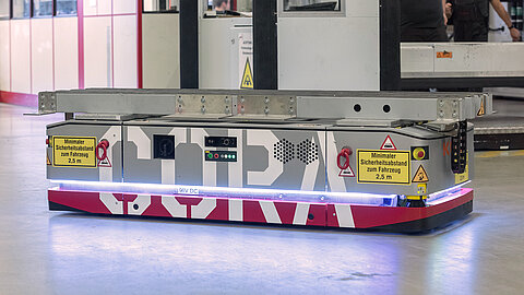 And if you watch the system at work you can’t help but be impressed, as the DTS, made by robotics specialist KUKA, moves fully autonomously and with almost uncanny sureness through its working area. The sophisticated drive technology enables it to move in any direction and ensures that the robot navigates to the required position, even in the tightest of spaces. Its laser sensor technology enables the DTS to function well, even in a dynamically changing working environment. The system can detect other vehicles or persons, reliably avoid obstacles and stop within a split second. It can also lift weights of up to 1,500 kg and even has the ability to learn because it is fitted with a navigation system that includes AI-supported mapping technology.